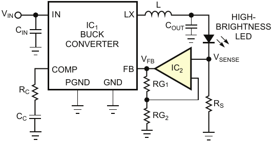 Figure 3. Adjusting the feedback signal improves the efficiency in this buck-converter driver for high-brightness LEDs