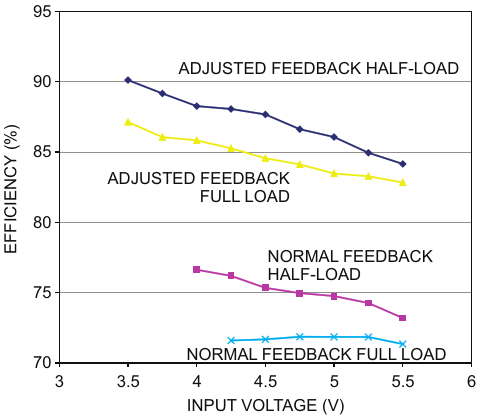 A comparison of a normal-feedback circuit (Figure 1) and an adjusted- feedback circuit (Figure 3) shows significant improvements in overall efficiency at half-loads and at full loads