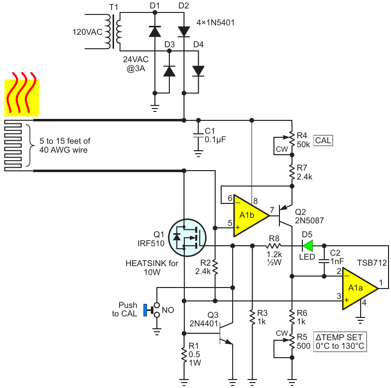 Figure 1,. A switch mode thermostat efficiently heats melded copper wire sensor/heater