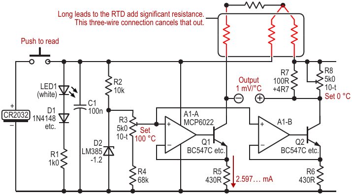 Three-wire connection to the RTD allows cancellation of the cable's resistance