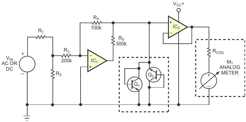 Based on rail-to-rail operational amplifier IC1, this circuit's input stage forms a diodeless, precision full-wave rectifier and enables the circuit of Figure 2 to display ac- or dc-voltage measurements on a dc meter