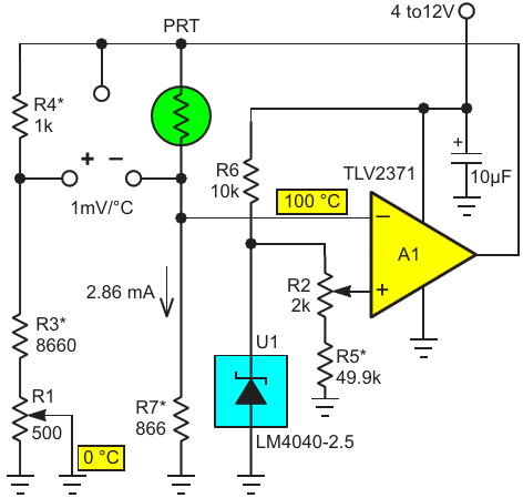 Figure 3. The 40 mV of positive feedback via R8 to reference U1 increases PRT excitation current with increasing temperature and thus linearizes the temperature reading, making the thermometer accurate to ±0.1 °C