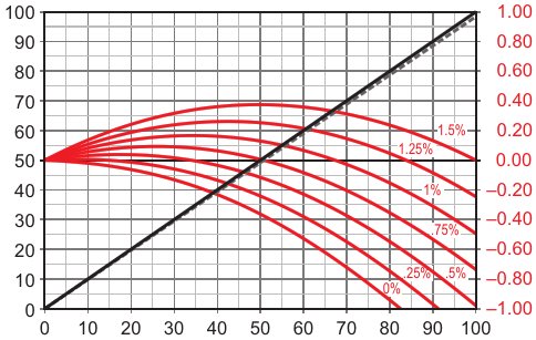 Figure 2. The Callendar-Van Dusen polynomial used here to predict that for any given temperature, an excitation current increment exists that will give an accurate readout, e.g., 0.5% for 33 °C, 1% for 67 °C, and 1.5% for 100 °C