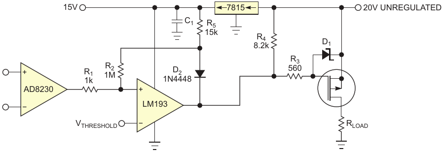 Figure 2. Resistor R5 and an ORing diode isolate the hysteresis circuit from the power supply and keep the switching point constant no matter how the power supply changes
