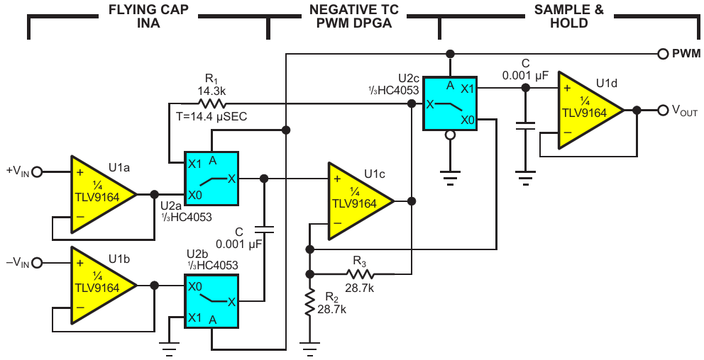 Negative time-constant and PWM program a versatile ADC front end