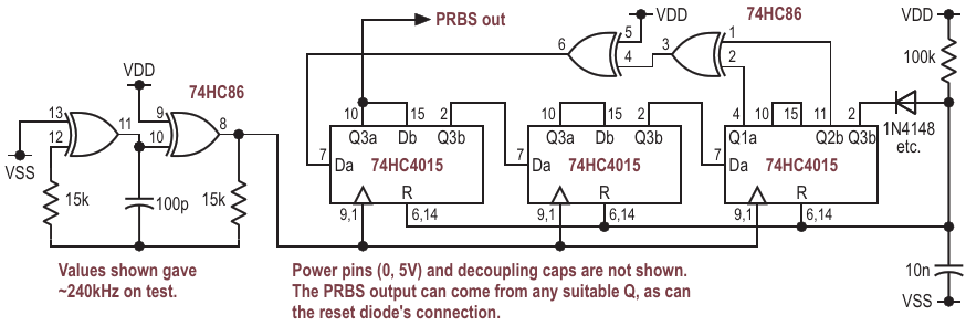 Figure 1. A pseudo-random sequence generator (PRSG) built with standard logic ICs generates wideband white noise