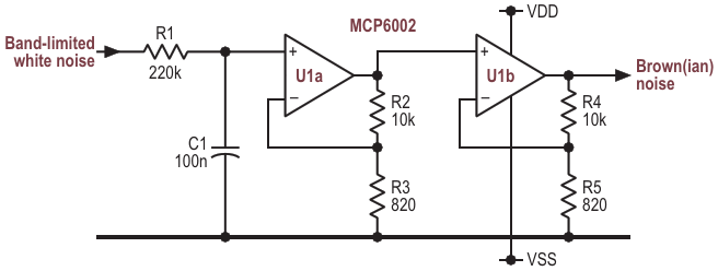 Figure 2. A pseudo-random signal - white noise - is tailored to fit within the audio band, and further filtered to produce pink noise as well