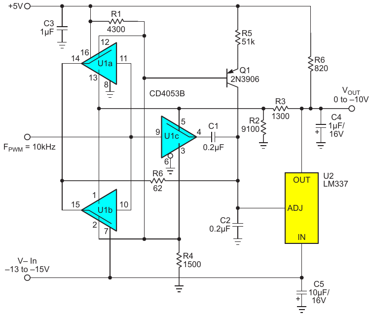 Figure 1. LM337 joins forces with 4053 CMOS switch to make a macho PWM DAC