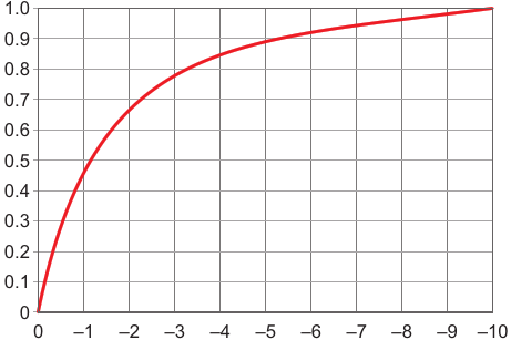 (0 V to -10 V) versus the PWM duty factor (0 to 1). [V
