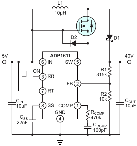 Figure 2. A 5 V to 40 V step-up regulator with the addition of the GaN FET