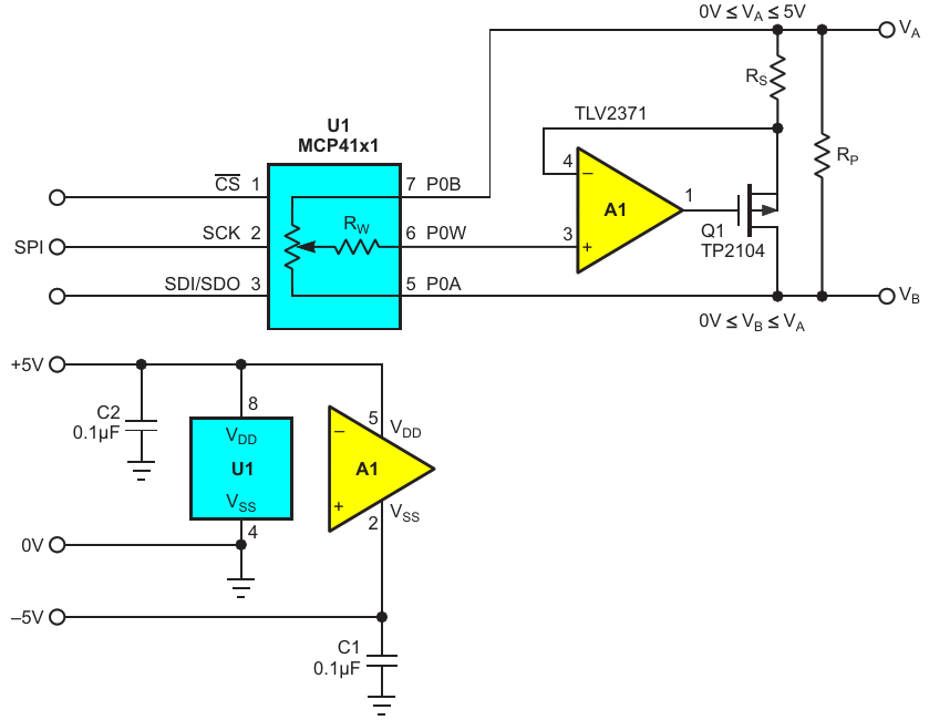 Figure 2. Synthetic Dpot evades problems by using FET shunt, precision fixed resistors, and op-amp