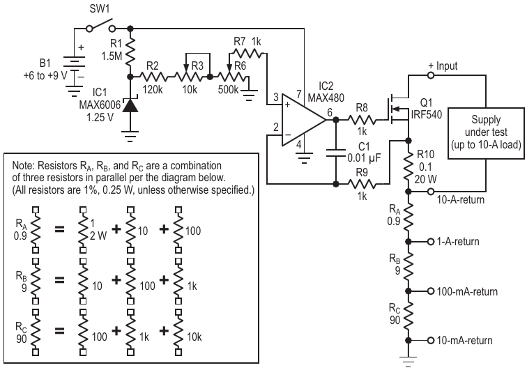 A low-power control circuit in this adjustable dummy load enables the high-resolution potentiometer R6 to precisely control load currents as large as 10 A