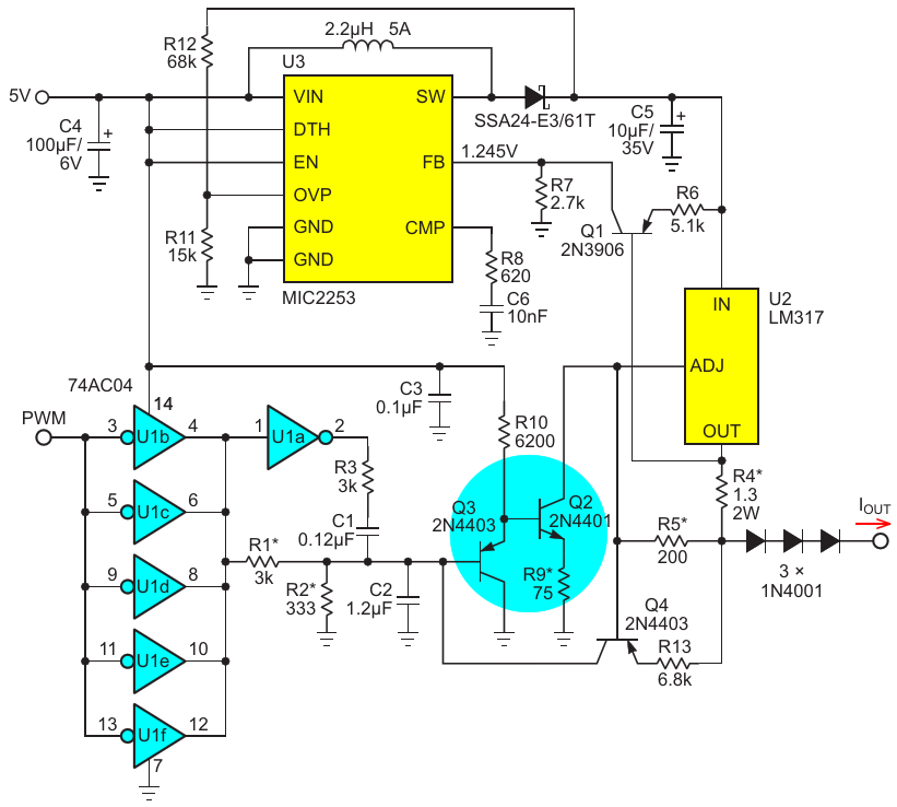 Figure 3. U2 current source programmed by U1 PWM DAC and powered by U3 tracking preregulator