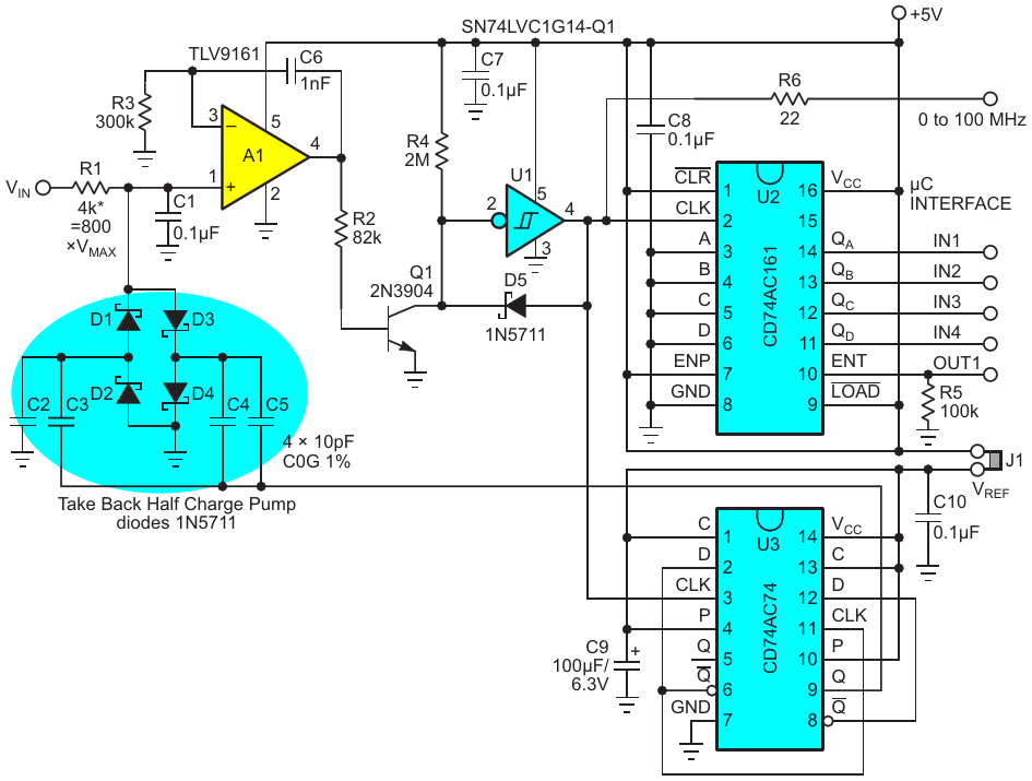 Figure 1. This simple VFC borrows some of Williams' pioneering speed ideas and combines them with a few tricks of my own to reach the high altitude of a 100-MHz full scale frequency