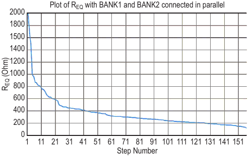 The variation in REQ with BANK1 (R = 1000 Ω) and BANK2 (R = 910 Ω) resistors (with SS), with the step number sequenced for obtaining monotonically decreasing resistance values