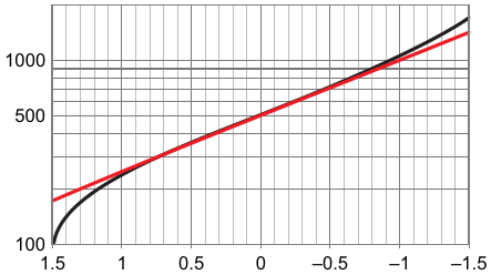Log plot of the frequency versus control voltage for the two-octave linear-in-pitch VCO. [X axis = VCON volts (inverted), Y axis = Hz / 16 = 250 Hz to 1 kHz]
