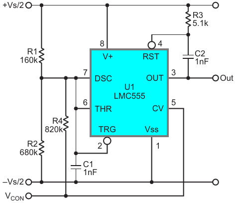 Figure 1. 555 VCO discharges timing cap C1 completely to the negative rail via a Reset pulse