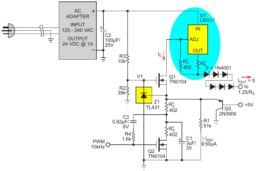 Figure 3. The 1-A, 15-V, PWM-programmed grounded-load current source with a novel LM317 topology. The asterisked resistors are 1% or better and R