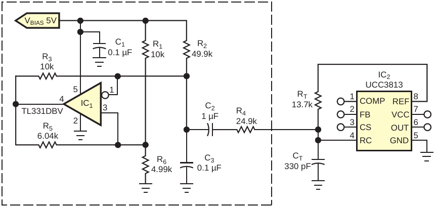 A low-frequency oscillator ramp, injected into the RC pin, modulates the supply's switching frequency