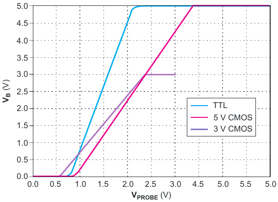 , limits at either the positive or negative supply rail depending on the probe voltage