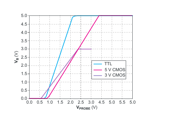 , limits at either the positive or negative supply rail depending on the probe voltage - 2