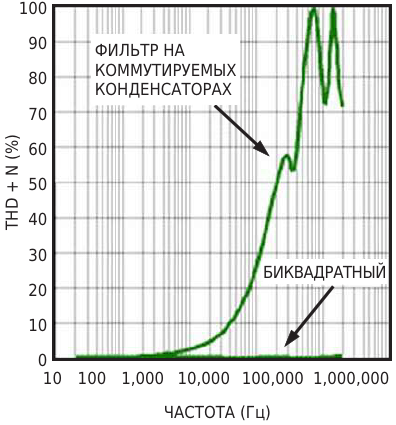 Noise (a) and low bandwidth (b) plague switched-capacitor filters The biquad filter of Figure 1 maintains less than 1% THD+N over the range 20 Hz to 200 kHz
