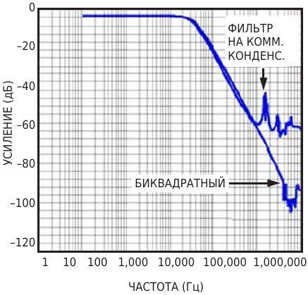 Figure 2. Noise (a) and low bandwidth (b) plague switched-capacitor filters. The biquad filter of Figure 1 maintains less than 1% THD+N over the range 20 Hz to 200 kHz