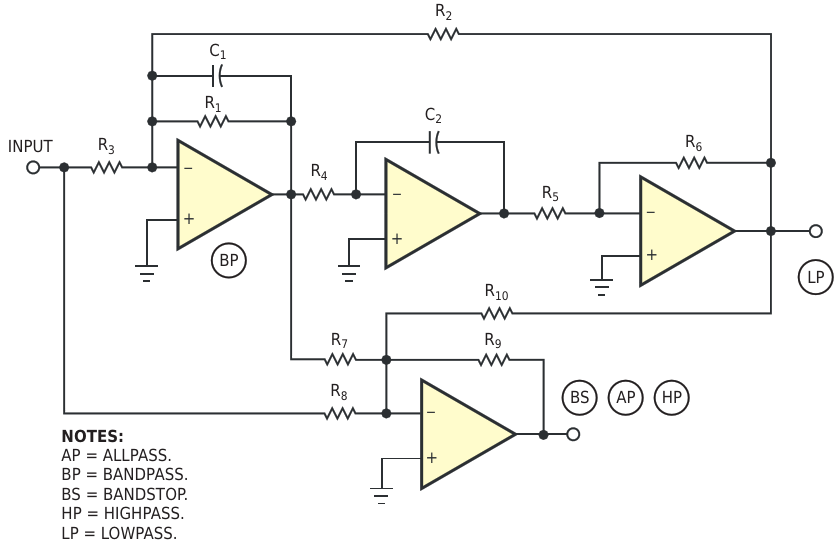 Figure 3. The standard biquad filter circuit produces lowpass and bandpass responses, and the addition of a fourth op amp produces a highpass response. Removing R10 and adjusting various component values produce a notch or bandstop response or an allpass