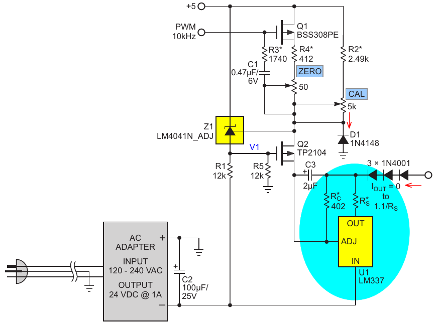 Figure 3. An 18 V, 1 A, PWM-programmed grounded load negative current source with a novel LM337 topology. With this topology, accuracy is insensitive to supply rail tolerance. The asterisked resistors are 1% or better and R