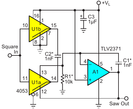 Figure 1. The usual topology for converting digital square waves to analog sawtooth requires a negative rail