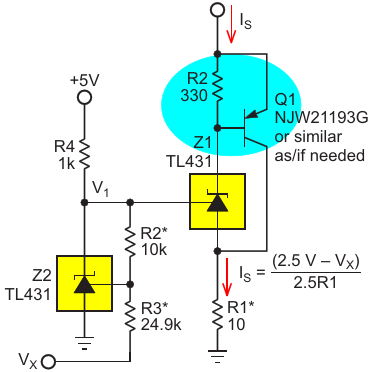 Figure 2. Booster transistor Q1 can handle current and voltage beyond 431 max IC and dissipation limits, while the 3.5-V voltage divider programs a constant I
