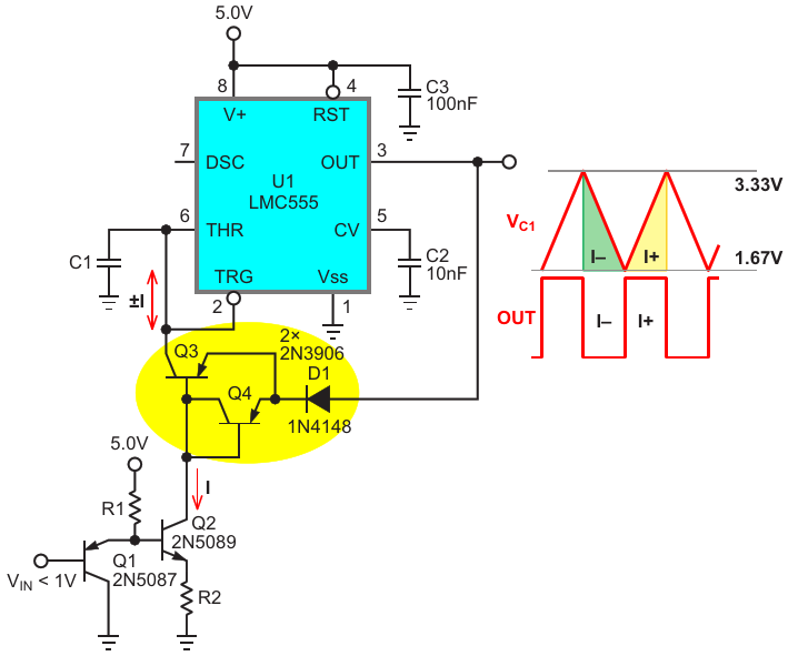 Figure 1. D1, Q3, and Q4 comprise the two-way current mirror. It passively conducts Q2's collector current to C1 via Q3's base-collector when OUT versus C1 is negative, but becomes an active inverting unity-gain current source when OUT goes positive and reverses th
