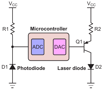 Figure 1. Using a microcontroller to regulate laser diode output power by sensing photodiode current