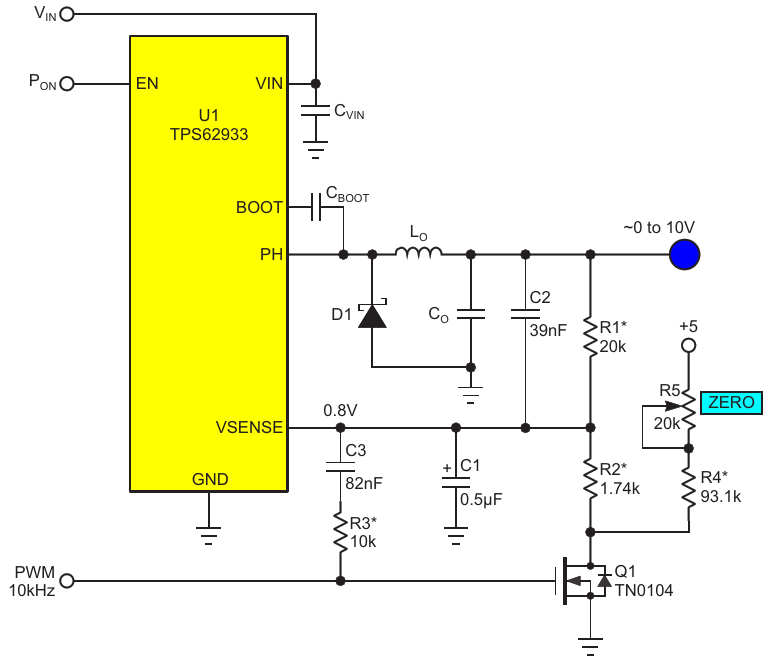 Figure 1. Five discrete parts comprise a circuit for linear regulator programming with PWM