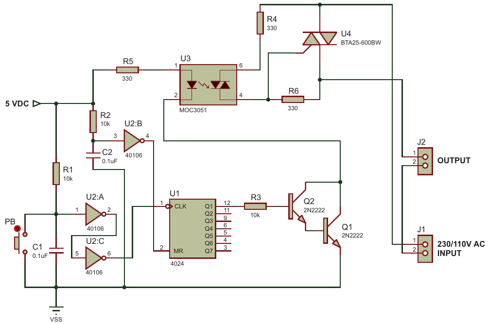 Figure 2. Circuit switches AC power on and off for output-connected gadgets using a solid-state relay formed by U3 and U4