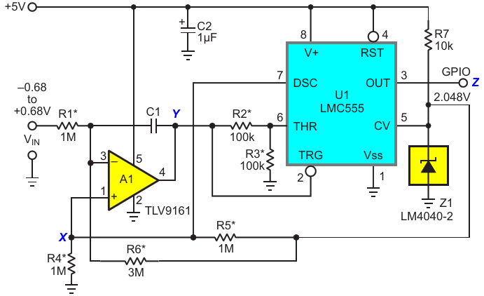 Op-amp A1 continuously integrates the incoming VIN signal, thus minimizing noise. Conversion occurs in alternating phases, T- and T+. The T-/T+ phase duration ratio is independent of the RC time constant, is therefore insensitive to C1 toleranc