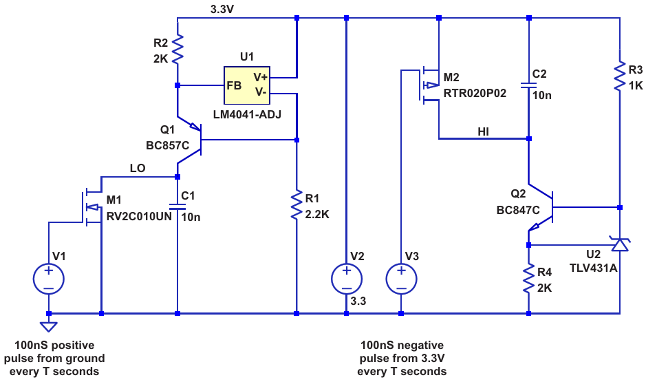 Figure 1. The circuitry to the left of the 3.3 V supply implements a ground-referenced sawtooth labeled "LO", while that to the right forms a 3.3 V-referenced one labeled "HI"