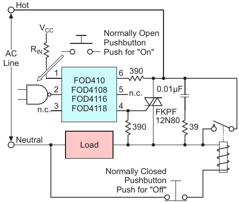 Figure 2. The revised triac drive arrangement with a relay added such that when the pushbutton is pressed, the triac turns on AC to the load using its zero-crossover feature