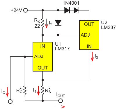Figure 3. Cross connection reduces self-heating error because shunt regulator U2 carries most of the current, getting relatively hot, while U1, whose VREF is in control, stays relatively cool and accurate