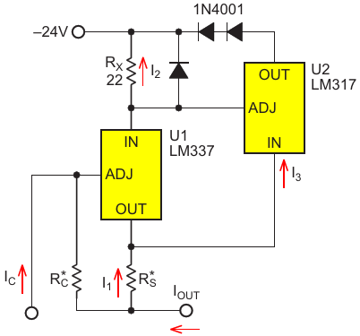 Figure 4. If the 317 and 337 swap places and the diodes reverse, Figure 3's circuit can work for negative current, too