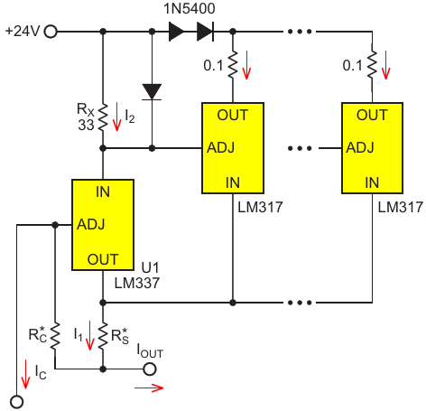 Figure 4. If the 317 and 337 swap places and the diodes reverse, Figure 3's circuit can work for negative current, too
