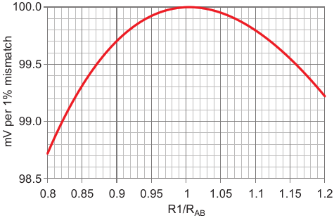 Figure 2. The output level (mV per 1% mismatch at Gain = 1) is not sensitive to the exact value of R1/R