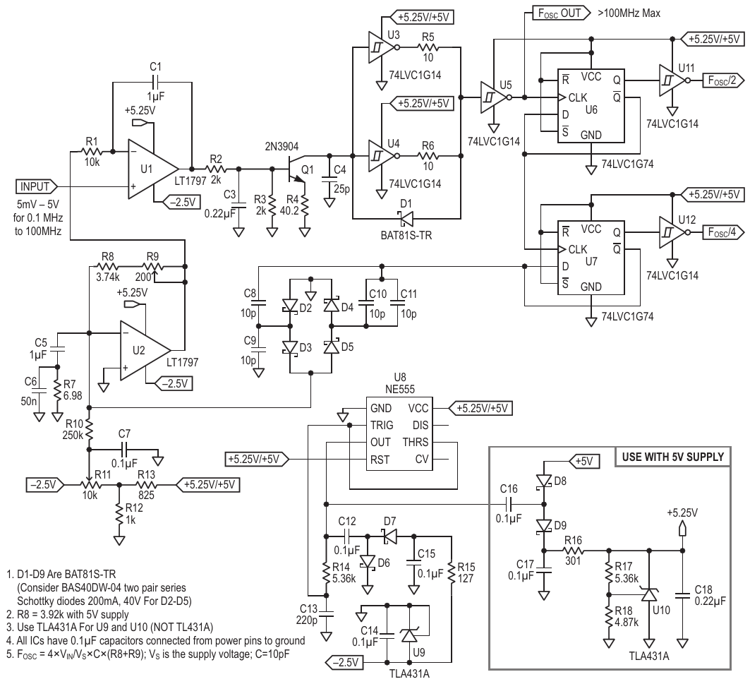 VFC design that operates from 100 kHz to beyond 100 MHz with a single 5.25-V supply, providing square wave outputs at 1/2 and 1/4 the main oscillator frequency
