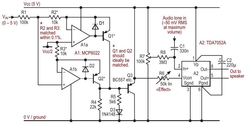 Figure 1. The TDA7052A's control voltage versus its gain, with the theoretical curve and practical readings