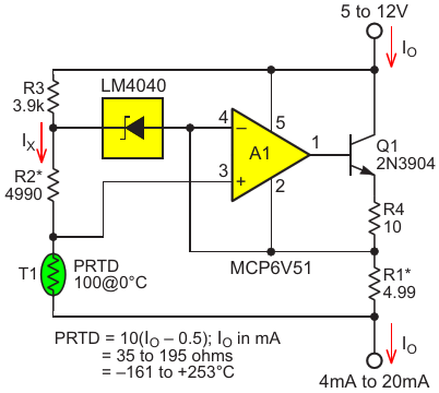 Simple but accurate 4 to 20 mA two-wire transmitter for PRTDs