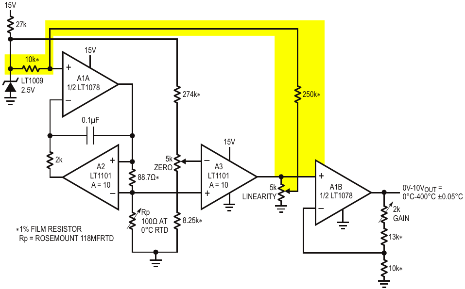 A platinum RTD bridge where feedback to the bridge from A3 linearizes the circuit