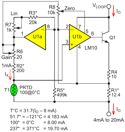 Figure 3. A PRTD transmitter based on the classic LM10 op-amp plus a 200 mV precision reference combo