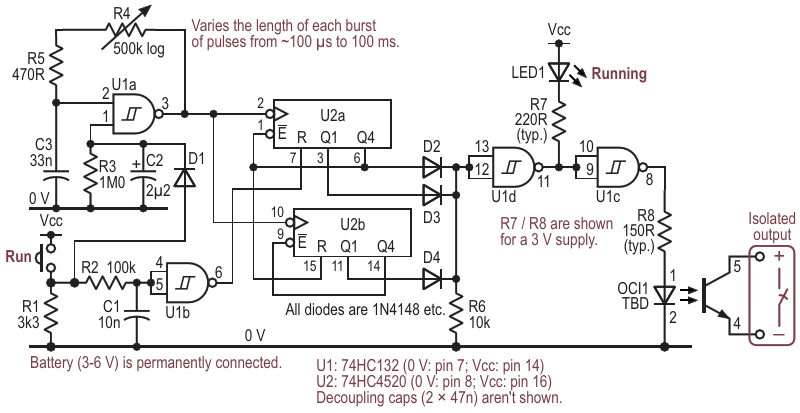 Figure 1. This contact-bounce simulator generates brief bursts of pulses when the Run button is either pressed or released, the burst durations ranging from about 100 µs to 100 ms. The optocoupler provides an isolated output that can pull up or down as needed