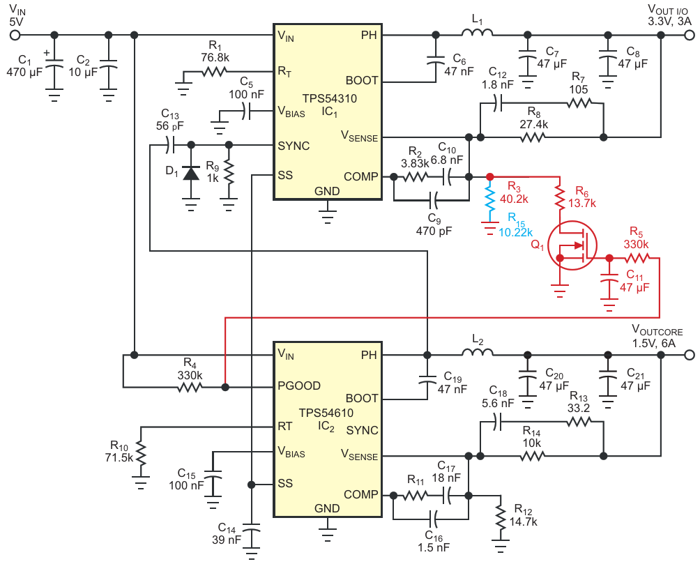 Figure 1. This circuit provides ratiometric (delete red path and components) or simultaneous power-up sequencing