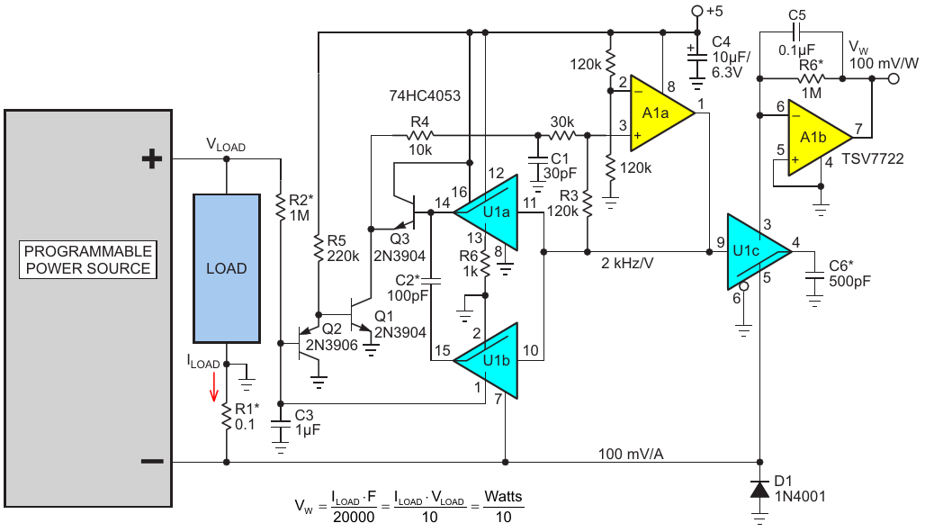 The "I×V = W" converter comprises voltage-to-frequency conversion (U1ab & A1a) with frequency (F) of 2000 × V